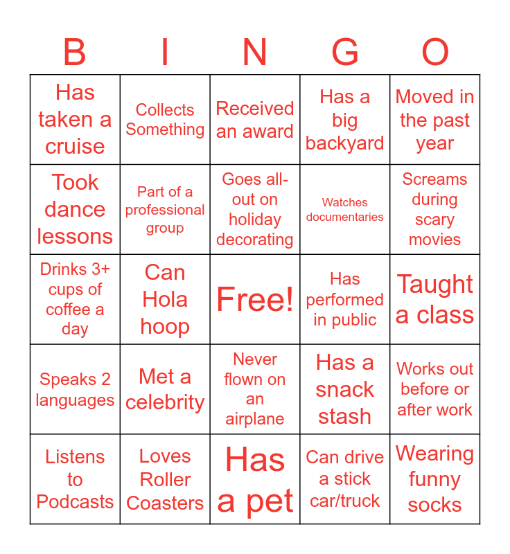 This bingo card has a free space and 24 words: Met a celebrity, Loves Roller Coasters, Goes all-out on holiday decorating, Listens to Podcasts, Moved in the past year, Has taken a cruise, Took dance lessons, Collects Something, Has performed in public, Never flown on an airplane, Watches documentaries, Drinks 3+ cups of coffee a day, Has a snack stash, Works out before or after work, Part of a professional group, Can drive a stick car/truck, Taught a class, Received an award, Screams during scary movies, Can Hola hoop, Wearing funny socks, Speaks 2 languages, Has a big backyard and Has a pet.