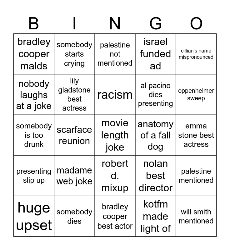 This bingo card has 25 words: madame web joke, bradley cooper best actor, racism, huge upset, cillian’s name mispronounced, bradley cooper malds, nobody laughs at a joke, somebody starts crying, anatomy of a fall dog, robert d. mixup, al pacino dies presenting, somebody is too drunk, nolan best director, palestine mentioned, lily gladstone best actress, will smith mentioned, emma stone best actress, palestine not mentioned, oppenheimer sweep, scarface reunion, movie length joke, somebody dies, presenting slip up, israel funded ad and kotfm made light of.
