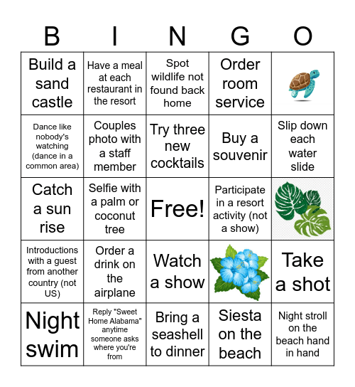 This bingo card has 4 images, a free space and 24 words: Take a shot, Ask a question or reply to a staff member in Spanish, Buy a souvenir, Siesta on the beach, Dance like nobody's watching (dance in a common area), Spot wildlife not found back home, Have a meal at each restaurant in the resort, Introductions with a guest from another country (not US), Participate in a resort activity (not a show), Night swim, Catch a sun rise, Order room service, Reply "Sweet Home Alabama" anytime someone asks where you're from, Bring a seashell to dinner, Slip down each water slide, Make a "that's what she said" joke to a stranger, Order a drink on the airplane, Couples photo with a staff member, Try three new cocktails, Watch a show, Build a sand castle, Try a new food you've never had before, Night stroll on the beach hand in hand and Selfie with a palm or coconut tree.