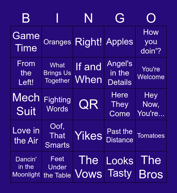 This bingo card has a free space and 29 words: Dancin' in the Moonlight, Man, oh Man, Fighting Words, Pretty Colors, Game Time, Right!, What Brings Us Together, Oof, That Smarts, Here They Come, Feet Under the Table, Hey Now, You're..., The Bros, The Vows, Looks Tasty, You're Welcome, Just Kidding, Yikes, Love in the Air, How you doin'?, Mech Suit, Past the Distance, That's How We Met, Angel's in the Details, From the Left!, Apples, Oranges, Tomatoes, If and When and Toodles.