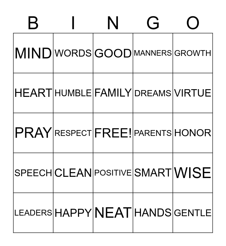 This bingo card has a free space and 24 words: CLEAN, HAPPY, FAMILY, LEADERS, GROWTH, MIND, HEART, WORDS, PARENTS, POSITIVE, DREAMS, PRAY, SMART, WISE, HUMBLE, HANDS, HONOR, GOOD, VIRTUE, RESPECT, GENTLE, SPEECH, MANNERS and NEAT.