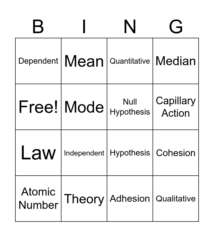 This bingo card has 16 words: Theory, Cohesion, Quantitative, Dependent, Law, Mean, Hypothesis, Adhesion, Free!, Mode, Atomic Number, Median, Independent, Capillary Action, Null Hypothesis and Qualitative.