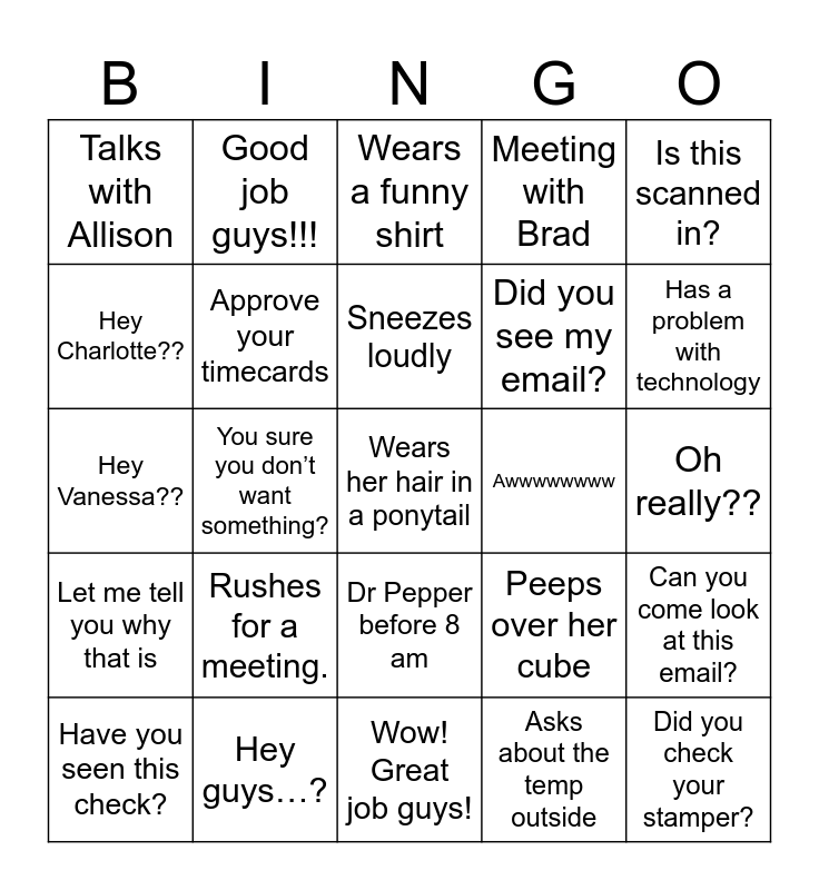 This bingo card has a free space and 24 words: Rushes for a meeting., Hey guys…?, Sneezes loudly, Have you seen this check?, Is this scanned in?, Talks with Allison, Hey Charlotte??, Good job guys!!!, Awwwwwwww, Dr Pepper before 8 am, Did you see my email?, Hey Vanessa??, Peeps over her cube, Can you come look at this email?, Approve your timecards, Asks about the temp outside, Oh really??, Wears a funny shirt, Has a problem with technology, You sure you don’t want something?, Did you check your stamper?, Let me tell you why that is, Meeting with Brad and Wow! Great job guys!.