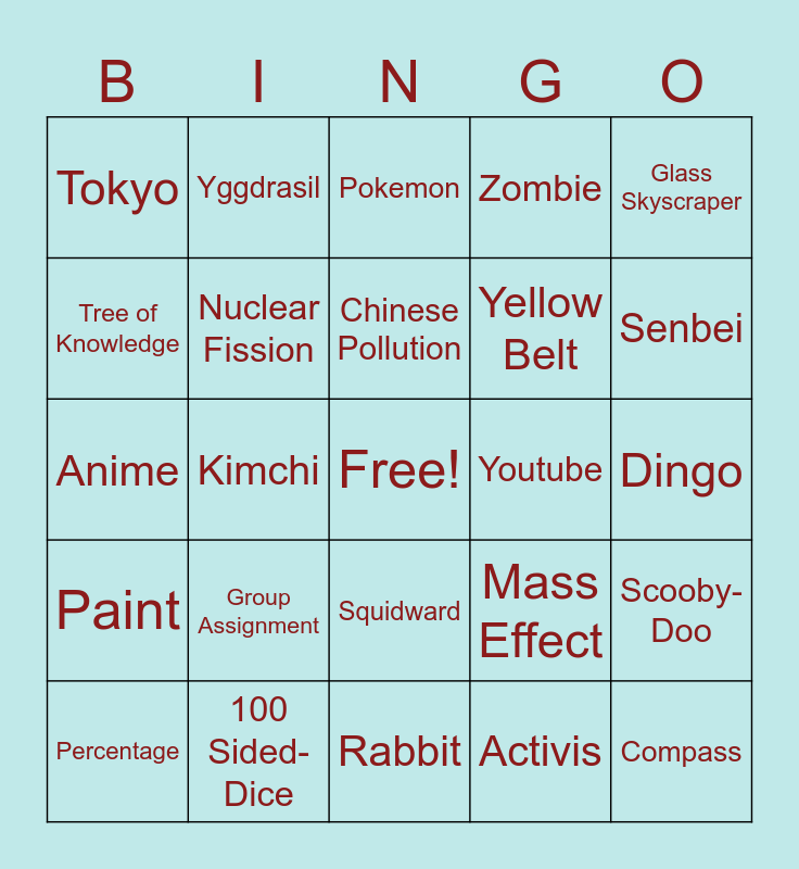 This bingo card has a free space and 24 words: Group Assignment, 100 Sided-Dice, Chinese Pollution, Percentage, Glass Skyscraper, Tokyo, Tree of Knowledge, Yggdrasil, Youtube, Squidward, Yellow Belt, Anime, Mass Effect, Scooby-Doo, Nuclear Fission, Activis, Dingo, Pokemon, Senbei, Kimchi, Compass, Paint, Zombie and Rabbit.