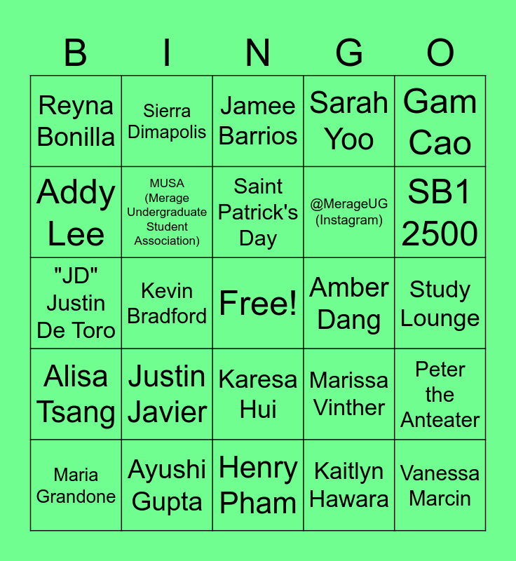 This bingo card has a free space and 24 words: Justin Javier, Ayushi Gupta, Saint Patrick's Day, Maria Grandone, Gam Cao, Reyna Bonilla, Addy Lee, Sierra Dimapolis, Amber Dang, Karesa Hui, @MerageUG (Instagram), "JD" Justin De Toro, Marissa Vinther, Peter the Anteater, MUSA (Merage Undergraduate Student Association), Kaitlyn Hawara, Study Lounge, Jamee Barrios, SB1 2500, Kevin Bradford, Vanessa Marcin, Alisa Tsang, Sarah Yoo and Henry Pham.