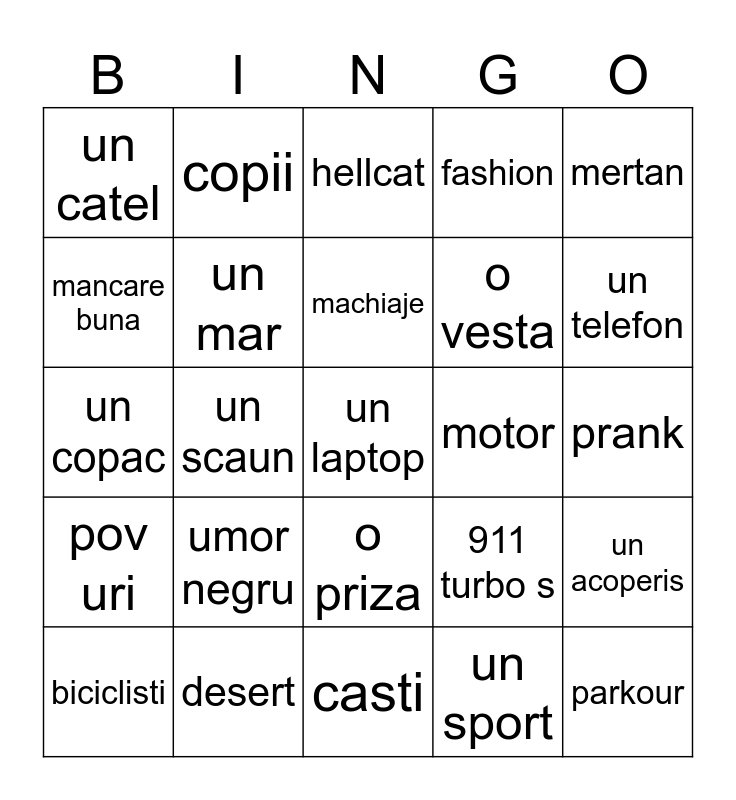 This bingo card has a free space and 24 words: umor negru, desert, machiaje, biciclisti, mertan, un catel, mancare buna, copii, motor, o priza, o vesta, un copac, 911 turbo s, un acoperis, un mar, un sport, prank, hellcat, un telefon, un scaun, parkour, pov uri, fashion and casti.