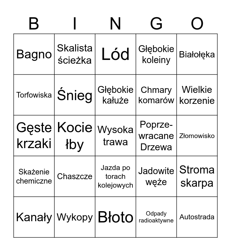 This bingo card has 25 words: Chaszcze, Błoto, Głębokie kałuże, Kanały, Białołęka, Bagno, Torfowiska, Skalista ścieżka, Poprze- wracane Drzewa, Jazda po torach kolejowych, Chmary komarów, Gęste krzaki, Jadowite węże, Stroma skarpa, Śnieg, Autostrada, Złomowisko, Lód, Wielkie korzenie, Kocie łby, Wysoka trawa, Wykopy, Skażenie chemiczne, Głębokie koleiny and Odpady radioaktywne.
