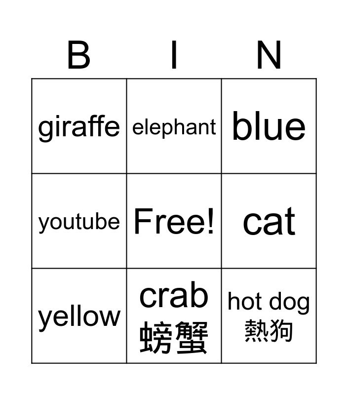 This bingo card has a free space and 9 words: yellow, blue, elephant, youtube, giraffe, cat, hot dog熱狗, black tea紅茶 and crab螃蟹.