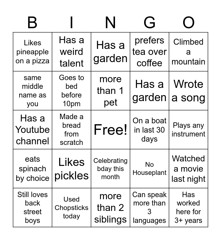This bingo card has a free space and 24 words: Likes pickles, Used Chopsticks today, more than 1 pet, Still loves back street boys, Climbed a mountain, Likes pineapple on a pizza, same middle name as you, Has a weird talent, On a boat in last 30 days, Celebrating bday this month, Has a garden, Has a Youtube channel, No Houseplant, Watched a movie last night, Goes to bed before 10pm, Can speak more than 3 languages, Plays any instrument, Has a garden, Wrote a song, Made a bread from scratch, Has worked here for 3+ years, eats spinach by choice, prefers tea over coffee and more than 2 siblings.