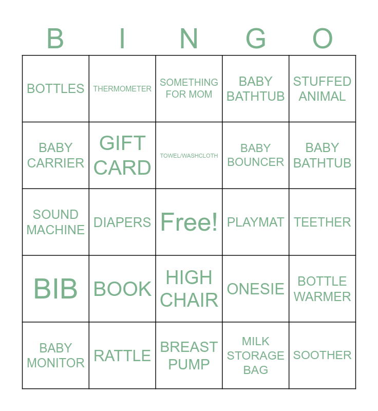 This bingo card has a free space and 29 words: BABY MONITOR, CHANGING PAD, DIAPERS, WIPES, BOTTLES, SOMETHING FOR MOM, GIFT CARD, BOOK, PLAYMAT, RATTLE, TEETHER, SOOTHER, BREAST PUMP, MILK STORAGE BAG, BABY BATHTUB, SWADDLE, HIGH CHAIR, BIB, STUFFED ANIMAL, SOUND MACHINE, ONESIE, OUTFIT, BABY BOUNCER, BABY CARRIER, BABY BATHTUB, THERMOMETER, BOTTLE WARMER, TOWEL/WASHCLOTH and NURSERY STORAGE.