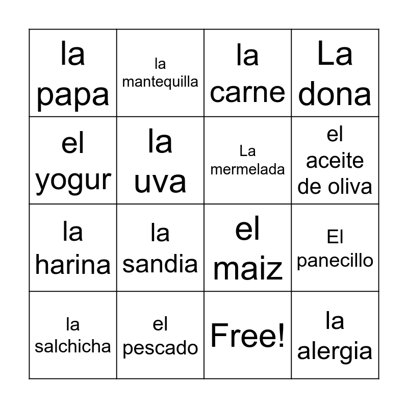 This bingo card has 17 words: Free!, la salchicha, la carne, la papa, la sandia, La dona, El panecillo, La mermelada, el aceite de oliva, la uva, el pescado, el maiz, el yogur, la mantequilla, la harina, el postre and la alergia.