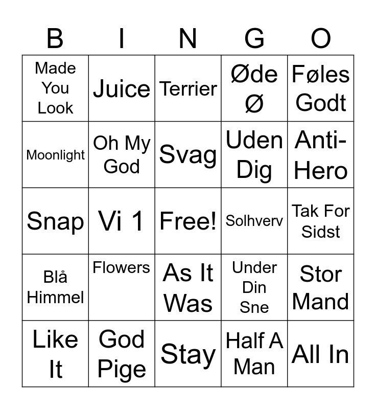 This bingo card has a free space and 24 words: Flowers, God Pige, Svag, Like It, Føles Godt, Made You Look, Moonlight, Juice, Solhverv, As It Was, Uden Dig, Snap, Under Din Sne, Stor Mand, Oh My God, Half A Man, Tak For Sidst, Terrier, Anti-Hero, Vi 1, All In, Blå Himmel, Øde Ø and Stay.