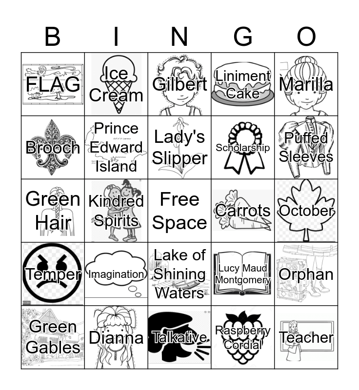 This bingo card has 28 images, a free space and 29 words: Anne, Dianna, Gilbert, Matthew, Marilla, FLAG, Prince Edward Island, Lady's Slipper, Carrots, Orphan, Green Gables, Kindred Spirits, Raspberry Cordial, Teacher, Green Hair, Red Hair, Talkative, Lucy Maud Montgomery, Puffed Sleeves, Temper, Imagination, String of Pearls, Scholarship, October, Brooch, Ice Cream, Lake of Shining Waters, Liniment Cake and Broken Ankle.