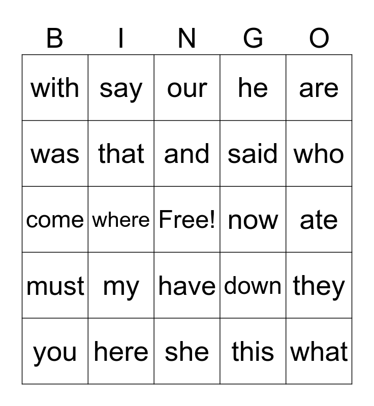 This bingo card has a free space and 24 words: my, here, and, you, are, with, was, say, now, have, said, come, down, they, that, this, ate, our, who, where, what, must, he and she.