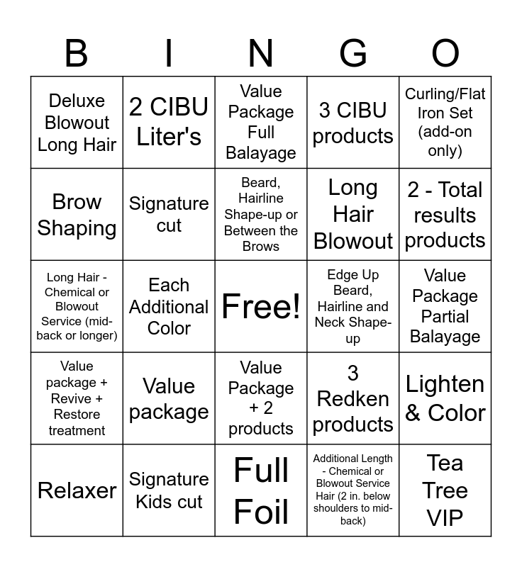 This bingo card has a free space and 49 words: CIBU Revive/Restore, Tea Tree VIP, Color Camo Gray Blending, Full Foil, Value package, 2 Redken Liter's, 2 CIBU Liter's, Scalp Massage, Brow Shaping, Gloss/Tone/Fashion Color, Signature cut, 3 CIBU products, Lighten & Color, 3 Redken products, Bang trim, Full Balayage, Beard, Hairline Shape-up or Between the Brows, Edge Up Beard, Hairline and Neck Shape-up, KeraRx Keratin Treatment, Curling/Flat Iron Set (add-on only), Each Additional Color, Additional Length - Chemical or Blowout Service Hair (2 in. below shoulders to mid-back), Deluxe Blowout Long Hair, Long Hair Blowout, 3 - Paul Mitchell products, 2 - Total results products, Relaxer, Tea Tree VIP, Value Package + 2 products, Value package + Revive + Restore treatment, Revive +Restore stand alone treatment, Value Package Single Color, Root touch-up & Gloss + Revive + Restore treatment, Signature Kids cut + Blowout, Signature Kids cut, Buzz cut, Brow Tint, Hair Removal Package Face & Brows, Value Package Partial Balayage, Value Package Perm, Value Package Signature Cut w/Classic Blowout, Value Package Signature Cut with Deluxe Blowout, Value Package Signature Kid's Cut with Clarifying Treatment & Classic Blowout, Tea Tree VIP with Blowout, Long Hair - Chemical or Blowout Service (mid-back or longer), Value Package Full Balayage, Value Package Partial Balayage, Value Package Partial Foil and Curling - Flat Iron Finish.