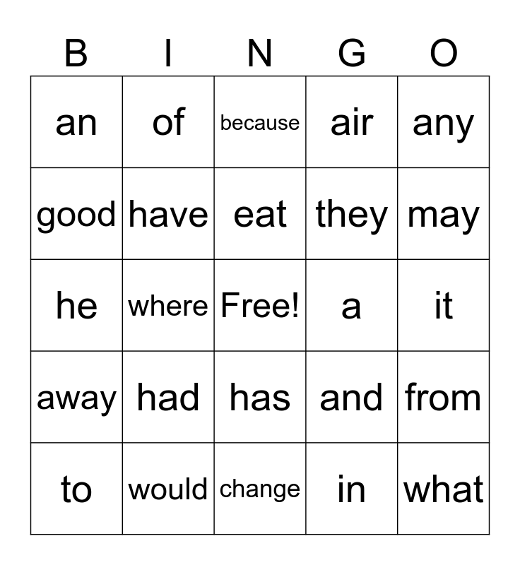 This bingo card has a free space and 24 words: had, would, eat, to, any, an, good, of, a, has, they, he, and, from, have, in, it, because, may, where, what, away, air and change.