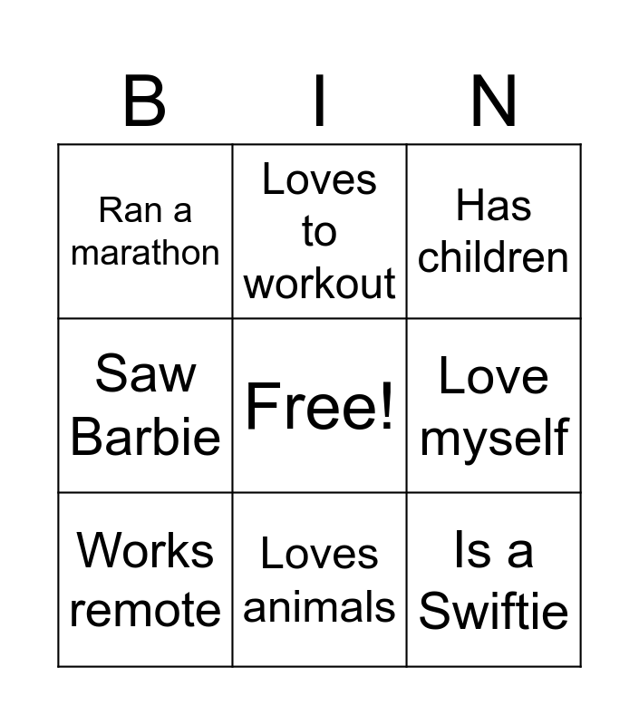 This bingo card has a free space and 8 words: Love myself, Has children, Loves to workout, Works remote, Ran a marathon, Is a Swiftie, Saw Barbie and Loves animals.