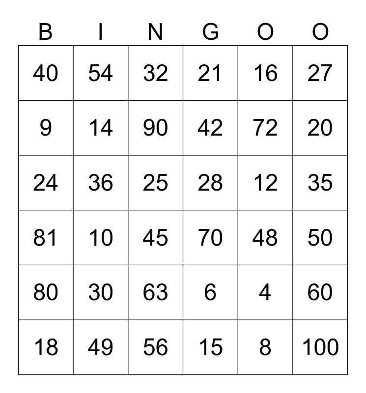 This bingo card has 37 words: 4, 6, 8, 9, 10, 12, 14, 15, 16, 18, 20, 21, 24, 25, 27, 28, 30, 32, 35, 36, 40, 42, 45, 48, 49, 50, 54, 56, 60, 63, 64, 70, 72, 80, 81, 90 and 100.