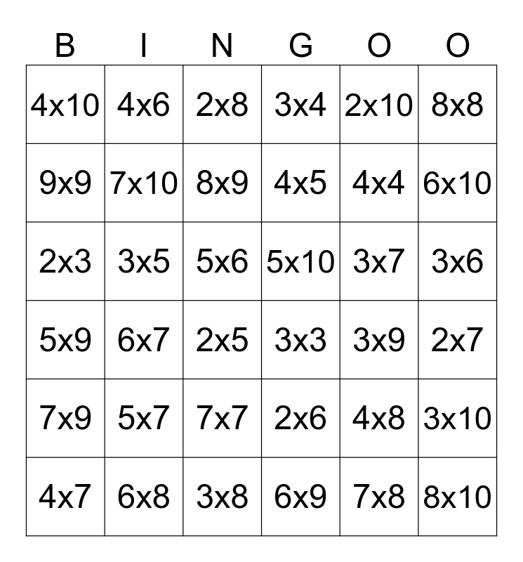 This bingo card has 44 words: 2x2, 2x3, 2x4, 2x5, 2x6, 2x7, 2x8, 2x9, 2x10, 3x3, 3x4, 3x5, 3x6, 3x7, 3x8, 3x9, 3x10, 4x4, 4x9, 4x5, 4x6, 4x7, 4x8, 4x10, 5x5, 5x6, 5x7, 5x8, 5x9, 5x10, 6x6, 6x7, 6x8, 6x9, 6x10, 7x7, 7x8, 7x9, 7x10, 8x8, 8x9, 8x10, 9x9 and 10x10.