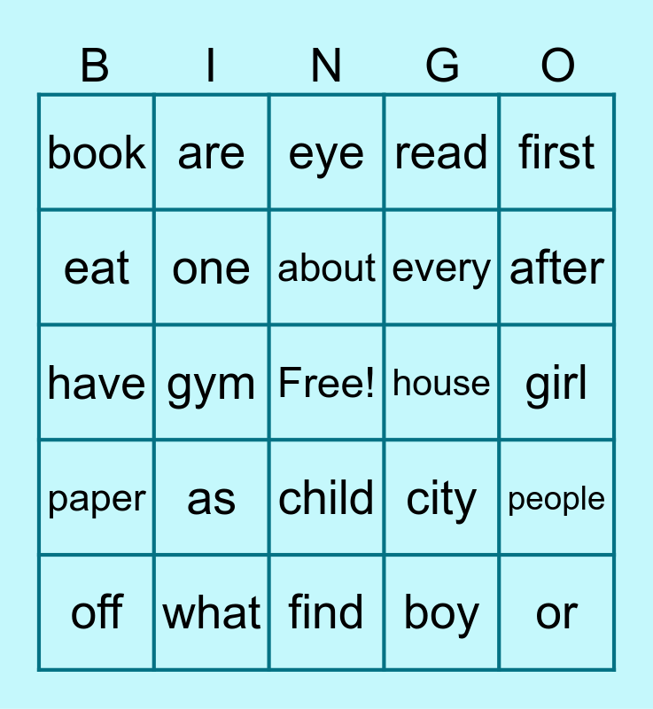 This bingo card has a free space and 24 words: as, what, about, off, first, book, eat, are, house, child, every, have, city, people, one, boy, girl, eye, after, gym, or, paper, read and find.