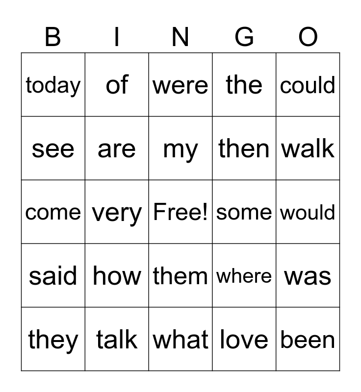 This bingo card has a free space and 29 words: they, who, very, have, today, were, are, how, some, talk, would, been, what, love, walk, again, them, said, could, come, where, should, then, see, the, of, was, my and look.