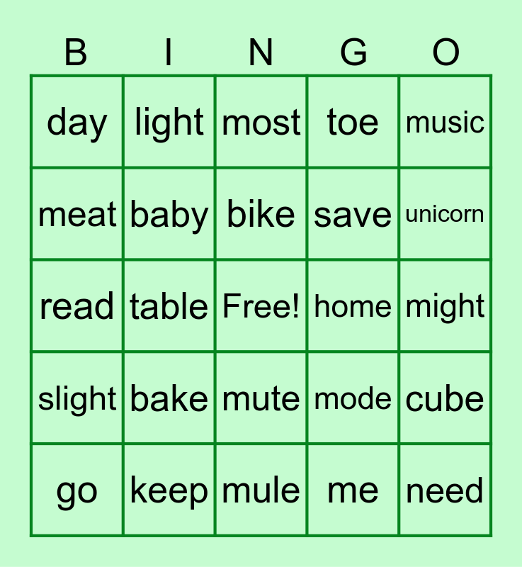 This bingo card has a free space and 24 words: bake, keep, bike, go, music, day, meat, light, home, mute, save, read, mode, cube, baby, me, might, most, unicorn, table, need, slight, toe and mule.