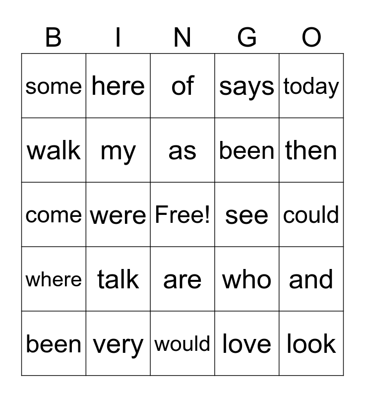 This bingo card has a free space and 29 words: been, them, were, how, some, of, my, talk, see, very, could, look, would, love, then, should, are, where, today, come, who, again, been, walk, says, here, and, as and do.