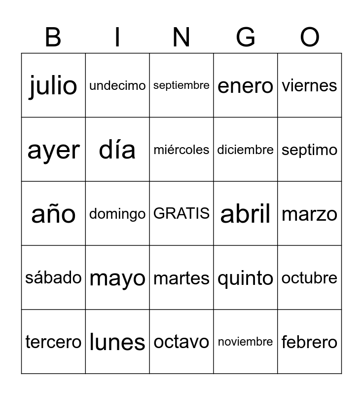 This bingo card has a free space and 40 words: fin de semana, año, mes, día, lunes, martes, miércoles, jueves, viernes, sábado, domingo, enero, febrero, marzo, abril, mayo, junio, julio, agosto, septiembre, octubre, noviembre, diciembre, ayer, anteayer, mañana, hoy, todos los días, semana, primero, Segundo, tercero, cuarto, quinto, septimo, octavo, noveno, decimo, undecimo and duodecimo.