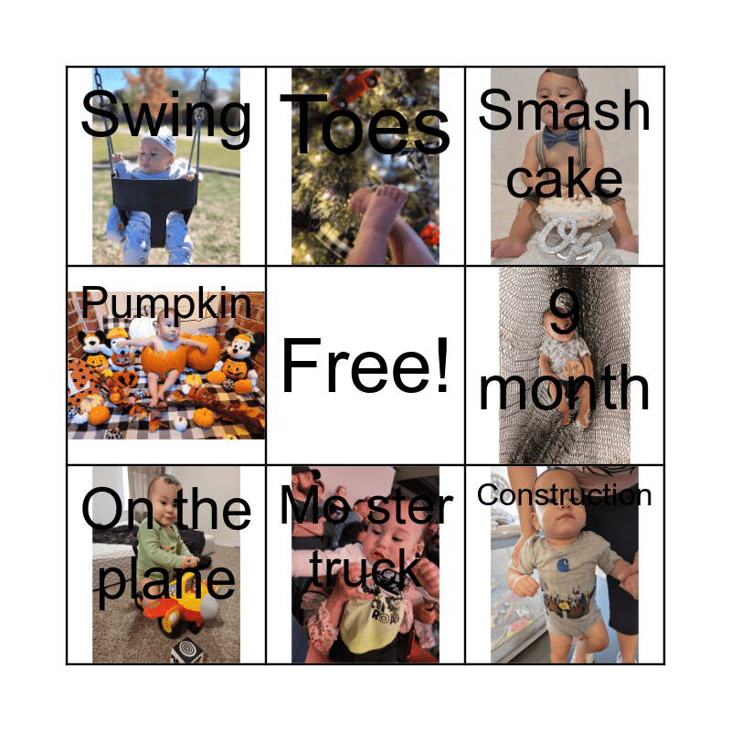 This bingo card has 11 images, a free space and 11 words: El torro, Mo ster truck, Construction, On the plane, Toes, Smash cake, 9 month, Christmas, Pumpkin, Swing and Con grandma.