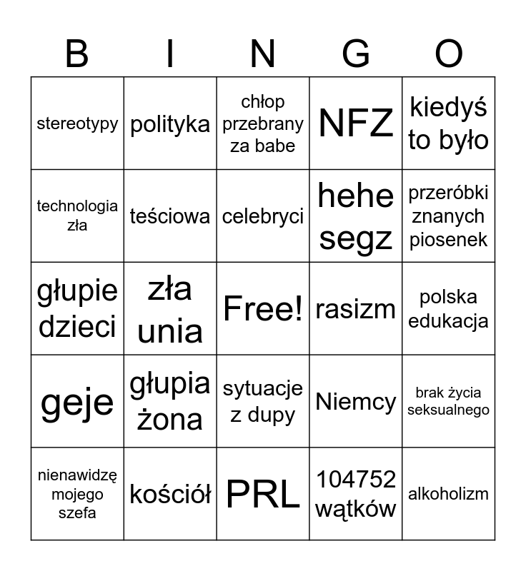 This bingo card has a free space and 24 words: głupia żona, kościół, celebryci, nienawidzę mojego szefa, kiedyś to było, stereotypy, technologia zła, polityka, rasizm, sytuacje z dupy, hehe segz, głupie dzieci, Niemcy, brak życia seksualnego, teściowa, 104752 wątków, polska edukacja, chłop przebrany za babe, przeróbki znanych piosenek, zła unia, alkoholizm, geje, NFZ and PRL.