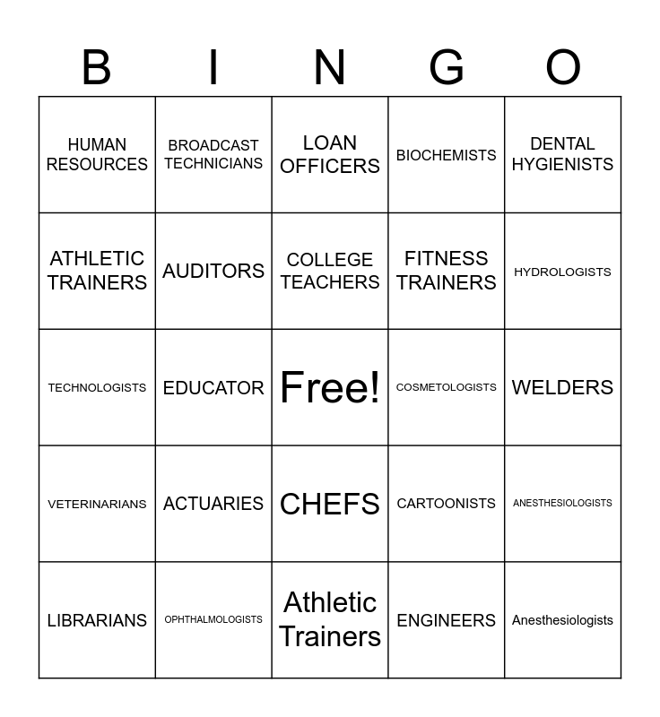 This bingo card has a free space and 51 words: Actuaries, Anesthesiologists, Appraisers, Athletic Trainers, ACTUARIES, AEROSPACE ENGINEERS, BROADCAST TECHNICIANS, APPRAISERS, ATHLETIC TRAINERS, AUDIOLOGISTS, AUDITORS, BIOCHEMISTS, ANESTHESIOLOGISTS, CARTOONISTS, GRADERS/SORTER, CLAIMS ADJUSTERS, COLLEGE TEACHERS, COSMETOLOGISTS, CURATORS, DENTAL HYGIENISTS, EDUCATOR, ENGINEERS, HUMAN RESOURCES, FITNESS TRAINERS, FASHION DESIGNERS, ZOOLOGISTS, HYDROLOGISTS, OCEANOGRAPHERS, LIBRARIANS, LOAN OFFICERS, NUCLEAR MEDICINE TECHNOLOGISTS, ONCOLOGISTS, LAWYERS, ROOFERS, OUTDOOR GUIDES, OPHTHALMOLOGISTS, PHOTOGRAPHERS, PHYSICAL THERAPISTS, PSYCHIATRISTS, PARK RANGERS, WELDERS, VETERINARIANS, SALES/MARKETING PROFESSIONALS, SOCIAL SCIENTISTS, TRANSLATORS/INTERPRETERS, RADIOLOGIC, TECHNOLOGISTS, TOUR GUIDES, REGISTERED NURSES (RNS), CHEFS and WEB DESIGNERS.