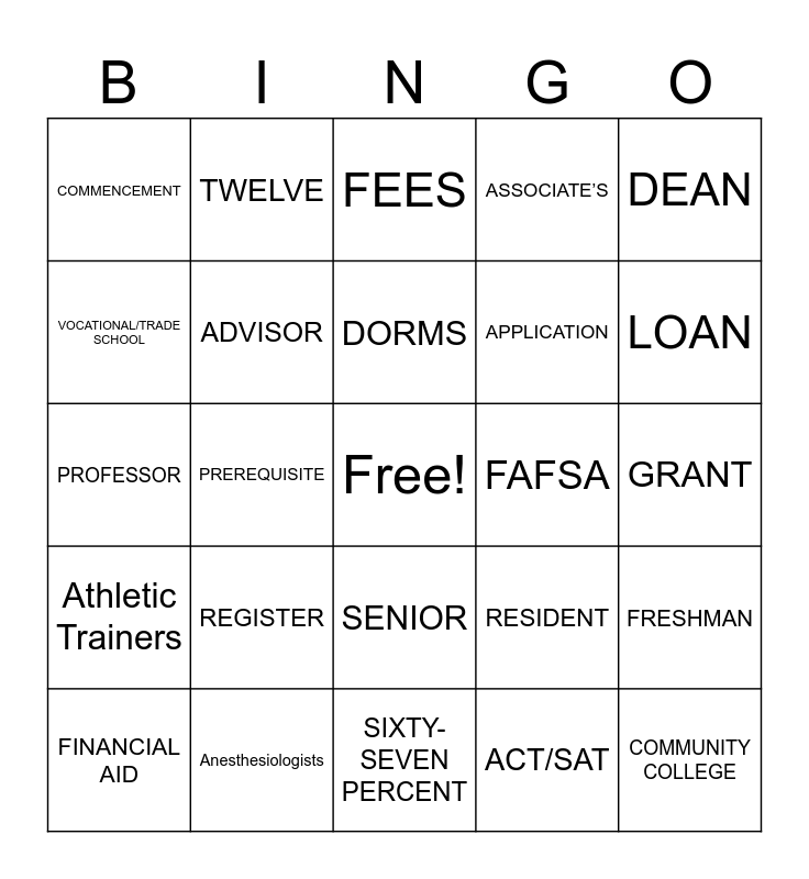 This bingo card has a free space and 58 words: Actuaries, Anesthesiologists, Appraisers, Athletic Trainers, ACT/SAT, ADJUNCT PROFESSOR, ADVISOR, ALUMNI, APPLICATION, AUDIT, ASSOCIATE’S, BACHELOR’S, BOARD OF TRUSTEES, CAMPUS, CERTIFICATE, COMMENCEMENT, COMMUNITY COLLEGE, DEAN, DIPLOMA, DORMS, FAFSA, FEES, FINANCIAL AID, FRESHMAN, GRADE POINT AVERAGE, GRANT, JUNIOR, LECTURES, LOAN, MAJOR, MASTER’S, MINOR, NCAA, OFFICE HOURS, ONE, PERSONAL ESSAY, Ph.D., PREREQUISITE, PROFESSOR, QUARTERS, REGISTER, RESIDENCE HALLS, RESIDENT, ADVISOR/ASSISTANT, ROOM AND BOARD, SCHOLARSHIP, SEMESTERS, SENIOR, SIXTY-SEVEN PERCENT, SOPHOMORE, STUDENT UNION, TRANSCRIPT, TUITION, TUTOR, TWELVE, UNIVERSITY, VOCATIONAL/TRADE SCHOOL and WORK STUDY.