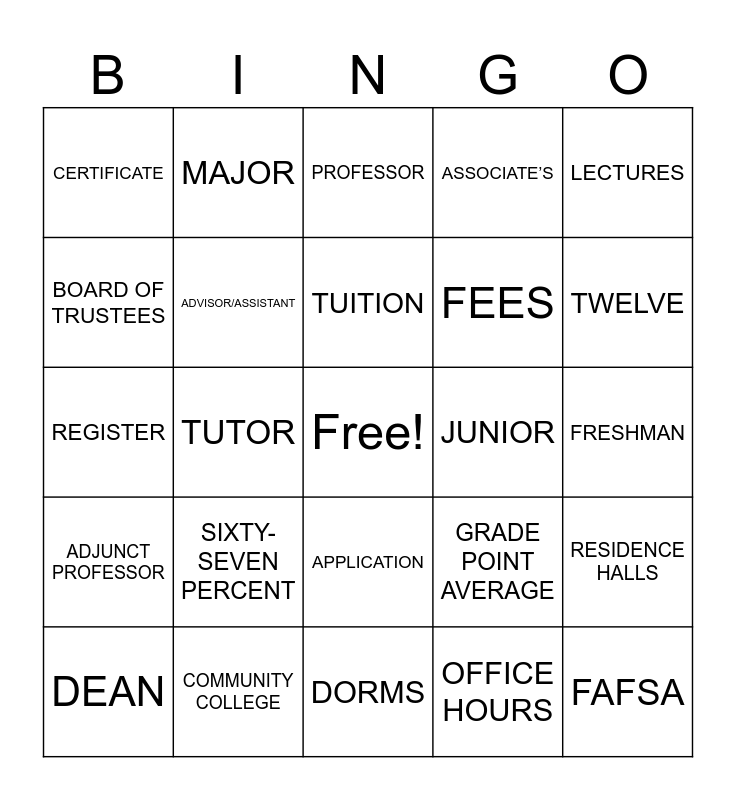 This bingo card has a free space and 54 words: ACT/SAT, ADJUNCT PROFESSOR, ADVISOR, ALUMNI, APPLICATION, AUDIT, ASSOCIATE’S, BACHELOR’S, BOARD OF TRUSTEES, CAMPUS, CERTIFICATE, COMMENCEMENT, COMMUNITY COLLEGE, DEAN, DIPLOMA, DORMS, FAFSA, FEES, FINANCIAL AID, FRESHMAN, GRADE POINT AVERAGE, GRANT, JUNIOR, LECTURES, LOAN, MAJOR, MASTER’S, MINOR, NCAA, OFFICE HOURS, ONE, PERSONAL ESSAY, Ph.D., PREREQUISITE, PROFESSOR, QUARTERS, REGISTER, RESIDENCE HALLS, RESIDENT, ADVISOR/ASSISTANT, ROOM AND BOARD, SCHOLARSHIP, SEMESTERS, SENIOR, SIXTY-SEVEN PERCENT, SOPHOMORE, STUDENT UNION, TRANSCRIPT, TUITION, TUTOR, TWELVE, UNIVERSITY, VOCATIONAL/TRADE SCHOOL and WORK STUDY.