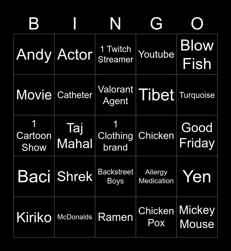 This bingo card has a free space and 24 words: Shrek, McDonalds, Valorant Agent, Kiriko, Blow Fish, Andy, Movie, Actor, Chicken, Backstreet Boys, Tibet, 1 Cartoon Show, Allergy Medication, Yen, Catheter, Chicken Pox, Good Friday, 1 Twitch Streamer, Turquoise, Taj Mahal, Mickey Mouse, Baci, Youtube and Ramen.