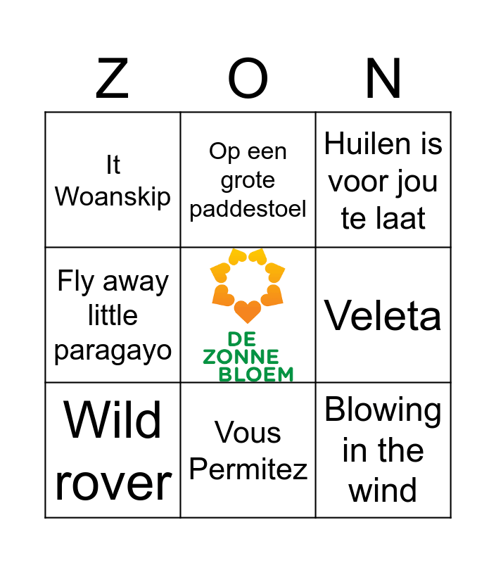 This bingo card has a free space and 8 words: Veleta, Huilen is voor jou te laat, Op een grote paddestoel, Wild rover, It Woanskip, Blowing in the wind, Fly away little paragayo and Vous Permitez.