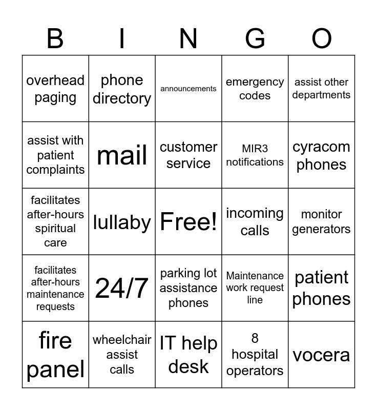 This bingo card has a free space and 24 words: 24/7, wheelchair assist calls, customer service, fire panel, assist other departments, overhead paging, assist with patient complaints, phone directory, incoming calls, parking lot assistance phones, MIR3 notifications, facilitates after-hours spiritual care, Maintenance work request line, patient phones, mail, 8 hospital operators, monitor generators, announcements, cyracom phones, lullaby, vocera, facilitates after-hours maintenance requests, emergency codes and IT help desk.