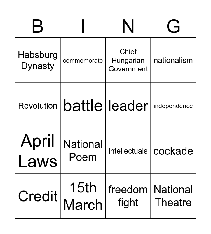 This bingo card has 20 words: cockade, Pilvax café, Chief Hungarian Government, Lads of March, Credit, Revolution, 15th March, Habsburg Dynasty, April Laws, commemorate, National Poem, intellectuals, battle, National Theatre, leader, Ferdinand V, independence, nationalism, freedom fight and Vienna uprising.