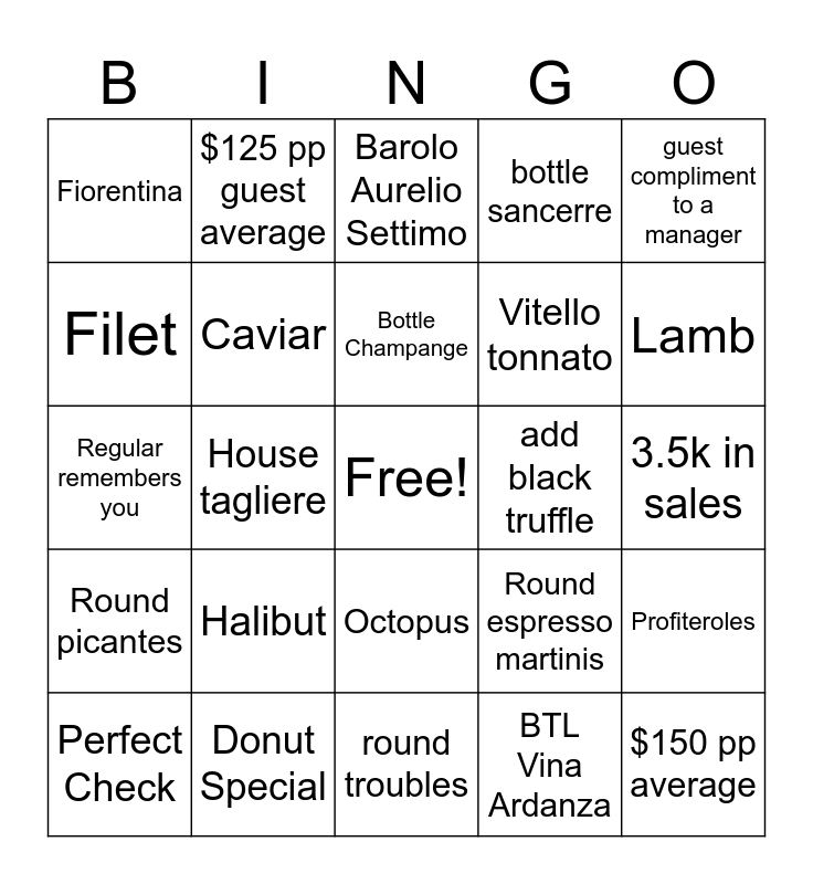 This bingo card has a free space and 24 words: Halibut, Donut Special, Bottle Champange, Perfect Check, guest compliment to a manager, Fiorentina, Filet, $125 pp guest average, add black truffle, Octopus, Vitello tonnato, Regular remembers you, Round espresso martinis, Profiteroles, Caviar, BTL Vina Ardanza, 3.5k in sales, Barolo Aurelio Settimo, Lamb, House tagliere, $150 pp average, Round picantes, bottle sancerre and round troubles.