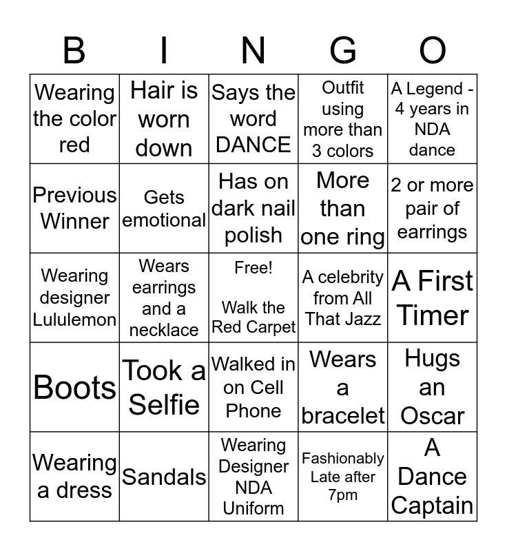This bingo card has a free space and 24 words: Took a Selfie, Sandals, Has on dark nail polish, Wearing a dress, A Legend - 4 years in NDA dance, Wearing the color red, Previous Winner, Hair is worn down, A celebrity from All That Jazz, Walked in on Cell Phone, More than one ring, Wearing designer Lululemon, Wears a bracelet, Hugs an Oscar, Gets emotional, Fashionably Late after 7pm, A First Timer, Says the word DANCE, 2 or more pair of earrings, Wears earrings and a necklace, A Dance Captain, Boots, Outfit using more than 3 colors and Wearing Designer NDA Uniform.