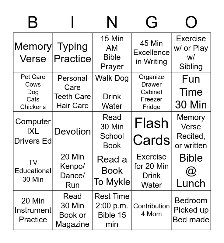 This bingo card has a free space and 24 words: 20 Min Kenpo/ Dance/ Run, Read 30 Min Book or Magazine, Walk Dog Drink Water, 20 Min Instrument Practice, Exercise w/ or Play w/ Sibling, Memory Verse, Pet Care Cows Dog Cats Chickens, Typing Practice, Flash Cards, Read a Book To Mykle, Organize Drawer Cabinet Freezer Fridge, Computer IXL Drivers Ed, Exercise for 20 Min Drink Water, Bible @ Lunch, Personal Care Teeth Care Hair Care, Contribution 4 Mom, Memory Verse Recited, or written, 15 Min AM Bible Prayer, Fun Time 30 Min, Devotion, Bedroom Picked up Bed made, TV Educational 30 Min, 45 Min Excellence in Writing and Rest Time 2:00 p.m. Bible 15 min.