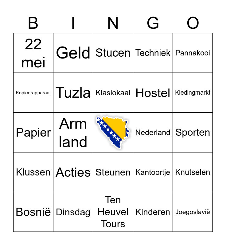 This bingo card has a free space and 55 words: Alfa-college, Bosnië, Out of Area, 22 mei, Ten Heuvel Tours, Dortmund, Tuzla, Bus, Hostel, 20 studenten, Techniek, Business School, Zorg en Welzijn, Uniformberoepen, Docenten, Gereedschappen, Pannakooi, Arm land, Oorlog, Joegoslavië, Nederland, Gymzaaltje, Kantoortje, Stucen, Schilderen, Klaslokaal, Kinderen, Spelletjes, Sporten, Knutselen, Activiteiten, Wensen, Computer, Internet, Kopieerapparaat, Papier, 27 mei, Klussen, Sarajevo, Gezellig, Geld, Bingo, Kluspot, November, Acties, Dinsdag, Winterfair, Statiegeld, Autowas-actie, Kledingmarkt, Kniepertjes verkoop, 2000 euro, Project, Steunen and Dank u.
