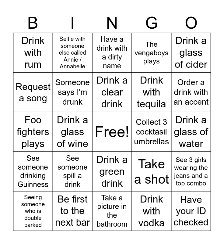This bingo card has a free space and 50 words: Take a photo with the bartender, Have your ID checked, Take a shot at a bar we are not going to, Take a picture in the bathroom, See someone spill a drink, Get a free drink from a stranger, Selfie with someone else called Annie / Annabelle, Shot with no hands, Request a song, Collect three bar coasters, Someone says I'm drunk, The vengaboys plays, See 3 girls wearing the jeans and a top combo, Take a shot, Drink a blue drink, Drink an orange drink, Drink a clear drink, Collect 3 cocktasil umbrellas, Drink a glass of beer, Drink a glass of cider, Drink a glass of wine, Drink with vodka, Drink with rum, Drink with tequila, Photo of two empty pitchers, Touch a moustache, Order a drink with an accent, Collect 6 lemon, lime and orange slices, Have a drink with a dirty name, Drink a green drink, Have a baby Guinness, Trade an article of clothing with someone, Post a picture with Annie on social media, Get a hug from Annie, Be first to the next bar, Spin 5 times and walk in a straight line, Spot an animal in a bar, Down a drink, Take a group photo, Drink a glass of water, Buy a friend a drink, Have a drink served in a weird shaped glass, Hear a green day song, Selfie with someone random, Seeing someone who is double parked, Foo fighters plays, Live band playing, Win a bar game, See someone drinking Guinness and Make it to Walrus.