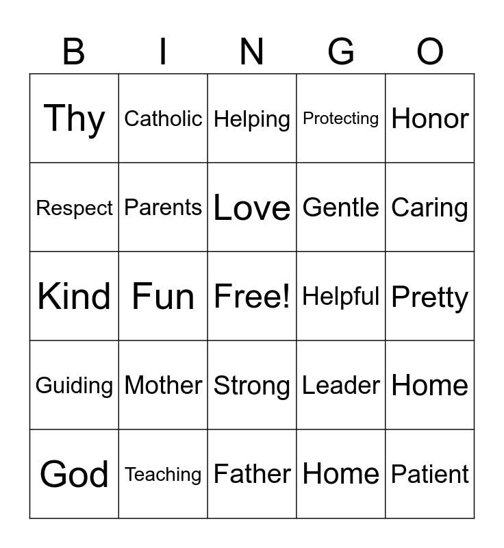This bingo card has a free space and 25 words: Mother, Father, Love, God, Honor, Thy, Respect, Catholic, Helpful, Strong, Gentle, Kind, Leader, Home, Parents, Handsome, Pretty, Helping, Caring, Fun, Patient, Teaching, Guiding, Protecting and Home.