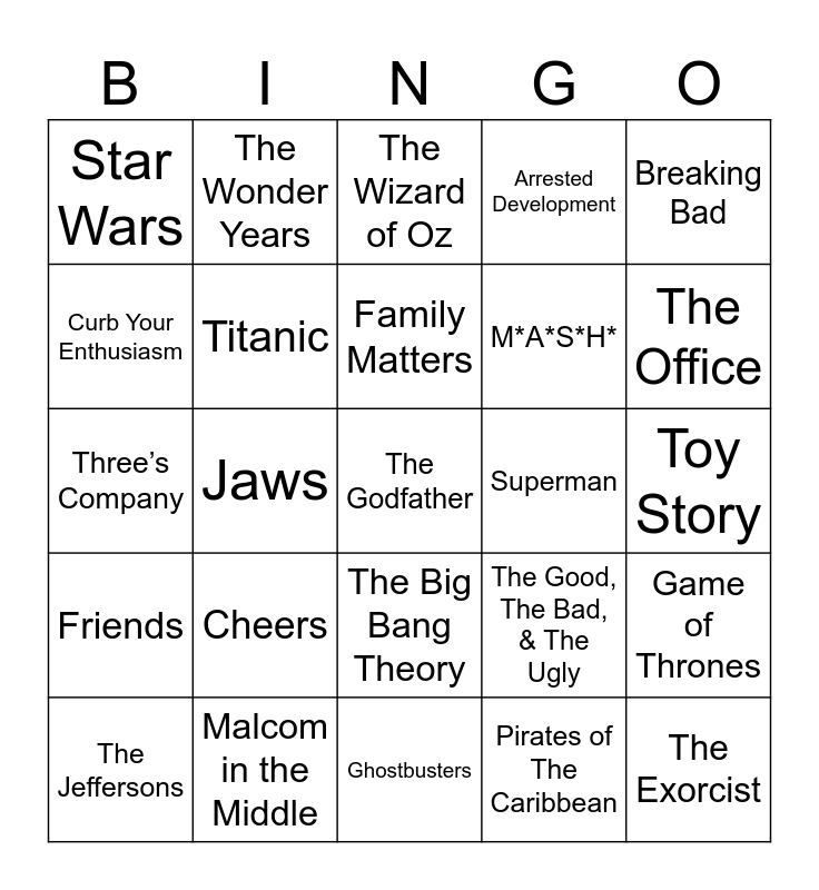 This bingo card has 31 words: Ghostbusters, Halloween, Jaws, Indiana Jones, Star Wars, The Wizard of Oz, Titanic, The Good, The Bad, & The Ugly, Superman, Pirates of The Caribbean, Toy Story, The Godfather, The Exorcist, Back to the Future, The Office, The X Files, Game of Thrones, Cheers, Friends, The Big Bang Theory, Breaking Bad, The Simpsons, The Jeffersons, The Wonder Years, M*A*S*H*, Curb Your Enthusiasm, Arrested Development, Three’s Company, Malcom in the Middle, Family Matters and Better Call Saul.