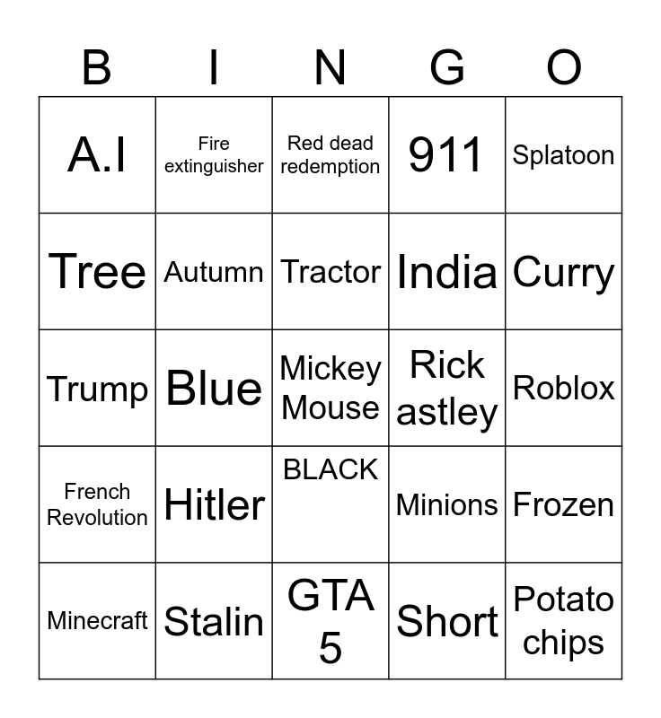 This bingo card has a free space and 24 words: Hitler, Stalin, Tractor, Minecraft, Splatoon, A.I, Tree, Fire extinguisher, Rick astley, BLACK, India, Trump, Minions, Frozen, Autumn, Short, Roblox, Red dead redemption, Curry, Blue, Potato chips, French Revolution, 911 and GTA 5.