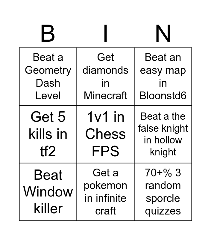 This bingo card has a free space and 8 words: Beat a the false knight in hollow knight, Beat an easy map in Bloonstd6, Get diamonds in Minecraft, Beat Window killer, Beat a Geometry Dash Level, 70+% 3 random sporcle quizzes, Get 5 kills in tf2 and Get a pokemon in infinite craft.