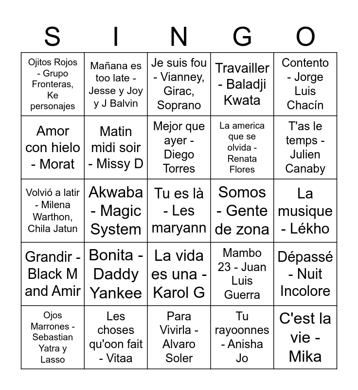 This bingo card has 25 words: Bonita - Daddy Yankee, Para Vivirla - Alvaro Soler, Mejor que ayer - Diego Torres, Ojos Marrones - Sebastian Yatra y Lasso, Contento - Jorge Luis Chacín, Ojitos Rojos - Grupo Fronteras, Ke personajes, Amor con hielo - Morat, Mañana es too late - Jesse y Joy y J Balvin, Somos - Gente de zona, La vida es una - Karol G, La america que se olvida - Renata Flores, Volvió a latir - Milena Warthon, Chila Jatun, Mambo 23 - Juan Luis Guerra, Dépassé - Nuit Incolore, Matin midi soir - Missy D, C'est la vie - Mika, La musique - Lékho, Je suis fou - Vianney, Girac, Soprano, T'as le temps - Julien Canaby, Akwaba - Magic System, Tu es là - Les maryann, Les choses qu'oon fait - Vitaa, Grandir - Black M and Amir, Travailler - Baladji Kwata and Tu rayoonnes - Anisha Jo.