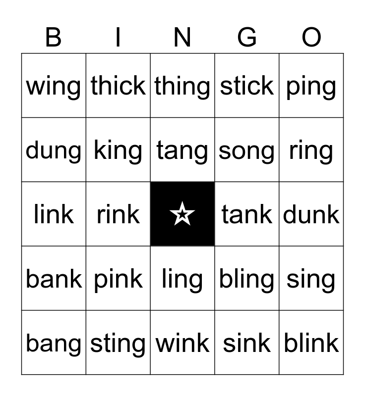 This bingo card has a free space and 24 words: pink, sting, tang, bang, ping, wing, dung, thick, tank, ling, song, link, bling, sing, king, sink, dunk, thing, ring, rink, blink, bank, stick and wink.