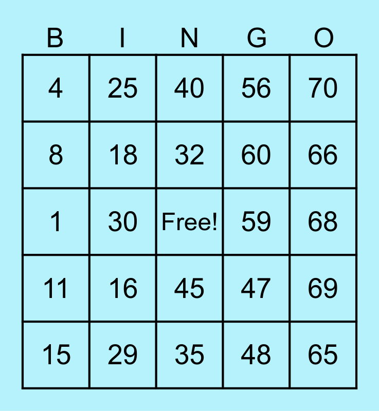 This bingo card has a free space and 24 words: 15, 16, 32, 48, 70, 4, 25, 40, 59, 68, 1, 18, 47, 69, 8, 29, 35, 56, 66, 11, 30, 45, 60 and 65.