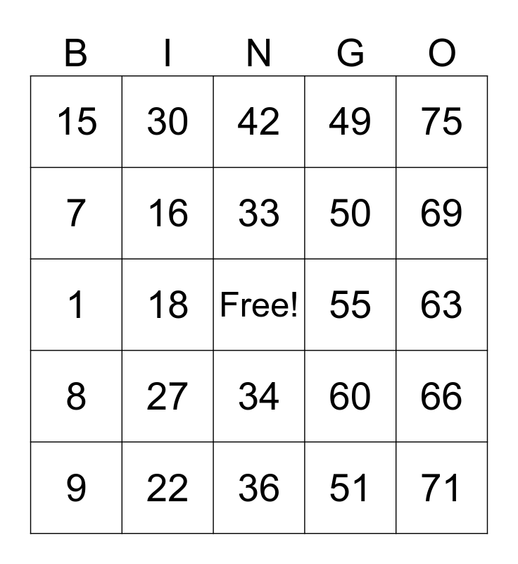 This bingo card has a free space and 24 words: 9, 27, 33, 51, 75, 15, 30, 42, 55, 63, 1, 16, 60, 66, 7, 22, 36, 49, 69, 8, 18, 34, 50 and 71.